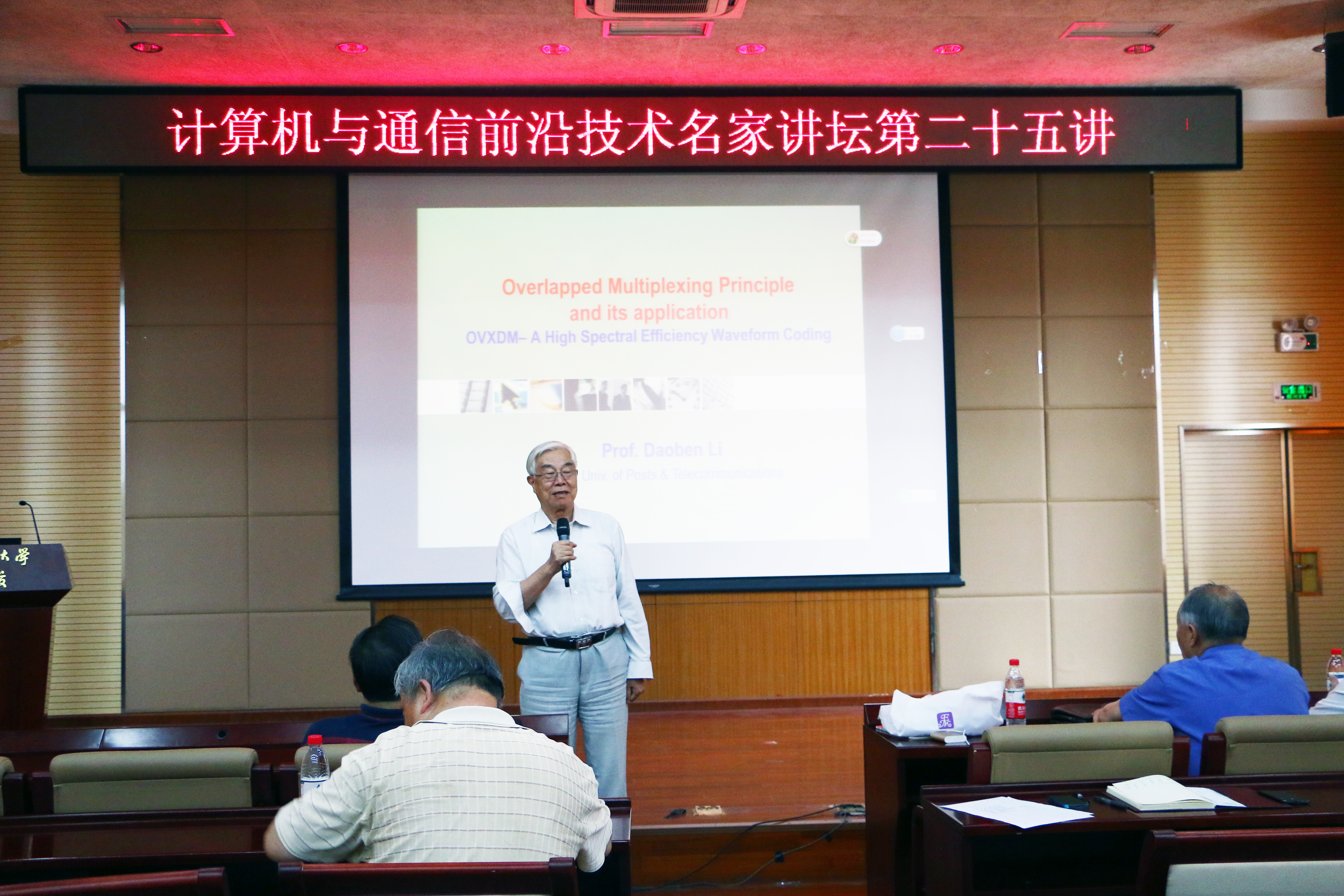 李道本教授讲述了高频谱效率的波形编码理论-OVXDM及其应用。他分析了正交频分复用策略、基于通信系统与运输系统的相似性,并通过分析香农公式的数学推导过程,另辟蹊径在频率域取样,避免符号干扰。同时李教授讲述了信道编码的本质,电频分隔下分隔必须大于噪声,OVFDM OVTDM是一对傅立叶变换。现代编码调制的缺点是离不开协作图。随后,他展示了OVXDM的波形编码模型。OVXDM的实质是用波形分隔取代电频分隔,与MIMO同为独立并联高速系统,但具有占比空间小的优点。李教授的成果严谨地遵循由数学推导、到仿真模型、再到实验验证的过程,对模型进行了物理意义上的扩展。实验组网是在上海市徐家汇四百多辆车在时速九十多公里时实测。实验结果的频谱效率具有较大优势。