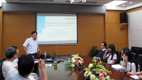 进行为期7天的学术交流与合作。2016年6月28日下午,徐殿祥教授在机电信息楼601作了题为“访问控制策略的自动化故障定位”的学术报告。报告会由孙昌爱教授主持,20余名师生参加了报告会。