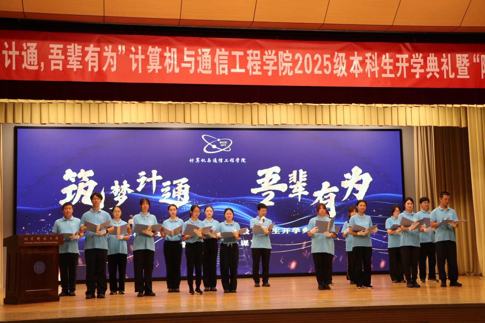 以代码为笔,以通信为墨。新生代表们用清晰洪亮、饱含感情的声音诉说青春豪情,带来献词《满井新程,代码启航》。他们明确自身使命,立下四年之约:用激情编写青春,用智慧构建未来,在北科沃土上谱写计通华章。