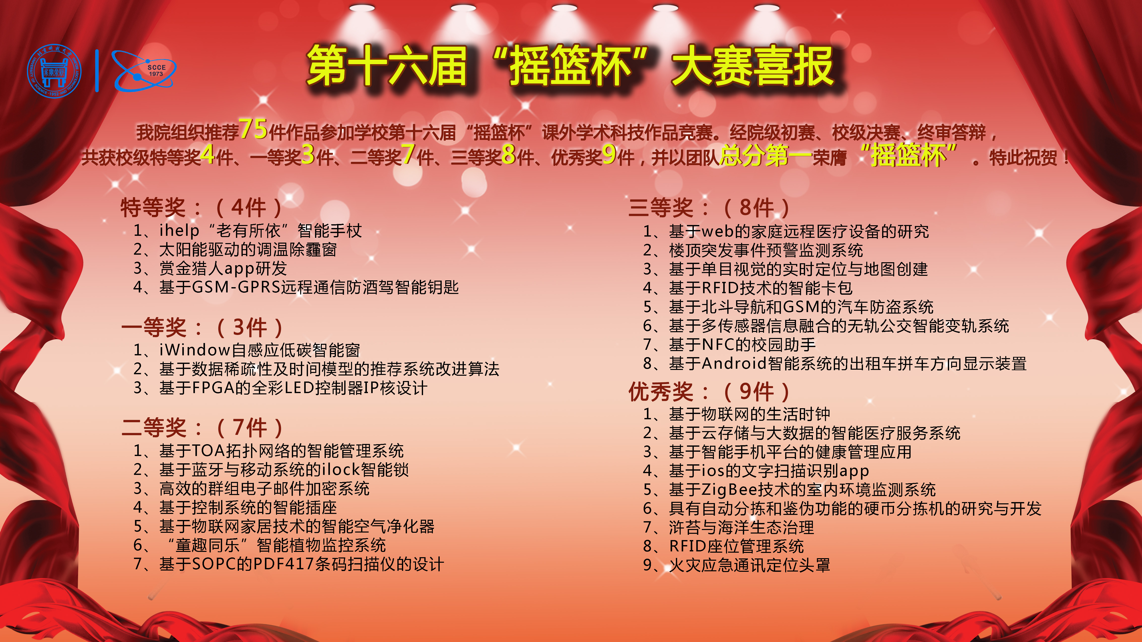 近日,色漫天堂 第十六届 “摇篮杯”大学生课外学术科技作品竞赛落幕,色漫天堂 取得优异成绩,以团队总分第一荣膺“摇篮杯”。色漫天堂 共组织推荐75件作品参加此次竞赛,经过院级初审、校级决赛、终审答辩...